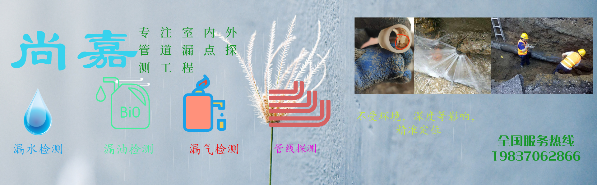 尚嘉管道检测服务有限公司,是一家专业查找室内外管道漏水的公司,进口设备,15年查漏经验,专业团队,快速精准定位漏水点,让损失降到最低,专业承接:水管漏水,暖气漏水,消防管道漏水,水务公司管线普查,管线探测,堵点精准定位,暖气,线管等均可精准定位,家庭漏水,学校,工厂,宾馆,水务公司,暖气公司,消防安装公司等均可,专业,专注,用心服务,欢迎来电咨询 4007676866